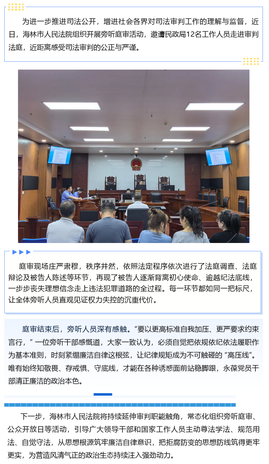 【旁听庭审】庭审“零距离”——海林市法院邀请民政局工作人员参加旁听庭审活动