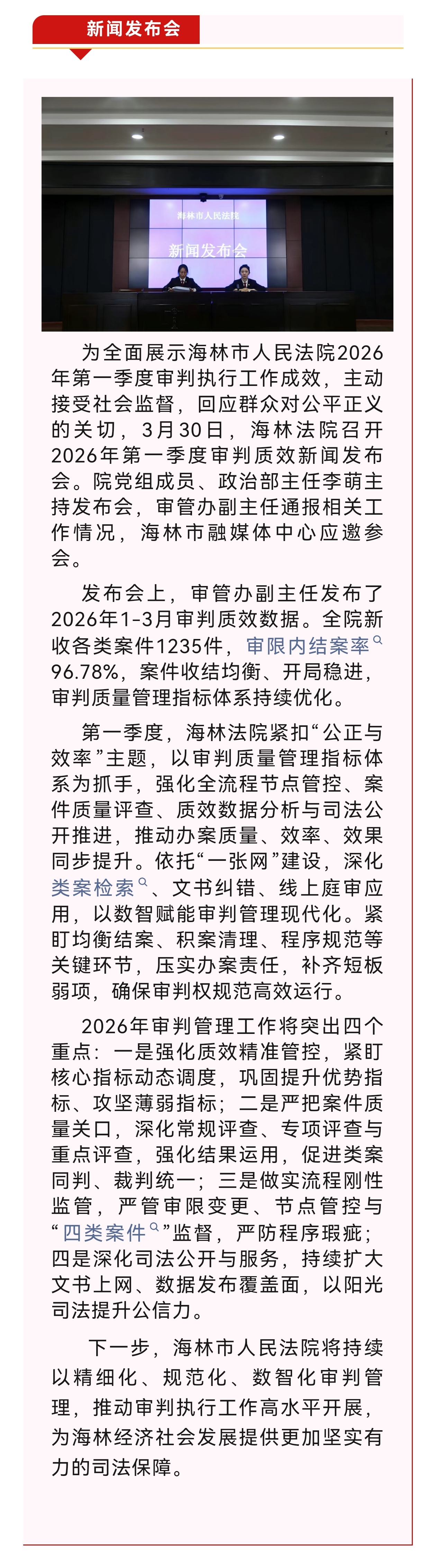 【新闻发布会】海林市人民法院召开2026年第一季度审判质效新闻发布会